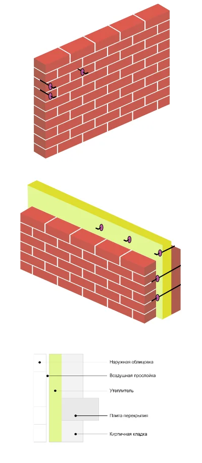 Такое количество кирпичей использовать нецелесообразно из-за нагрузки на фундамент и сложности монтажа, поэтому стены делают двухслойными. Возводят внутреннюю и внешнюю, оставляя между ними пространство в 50 сантиметров для свободной циркуляции воздуха. Это помогает удерживать тепло и исключить образование конденсата. Но для полноценного утепления этого недостаточно. Теплоизолировать межстеновое пространство рулонными или мягкими материалами сложно. Метод заливки пустот ППУ позволяет равномерно заполнить все зазоры внутри стен и между ними.
