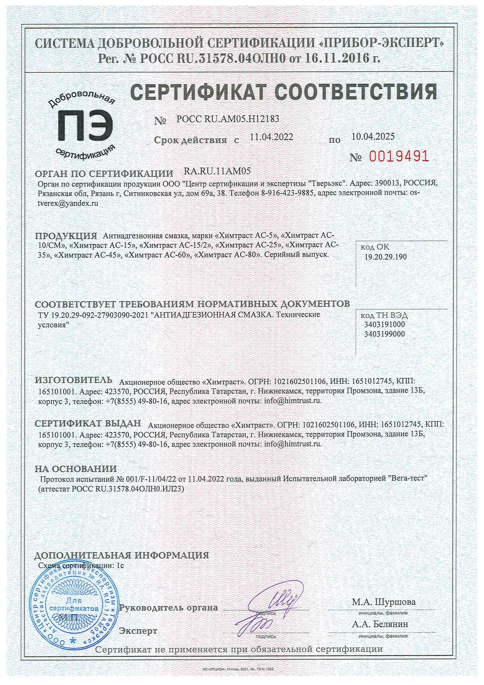 Сертификат соответствия на антиадгезионную смазку